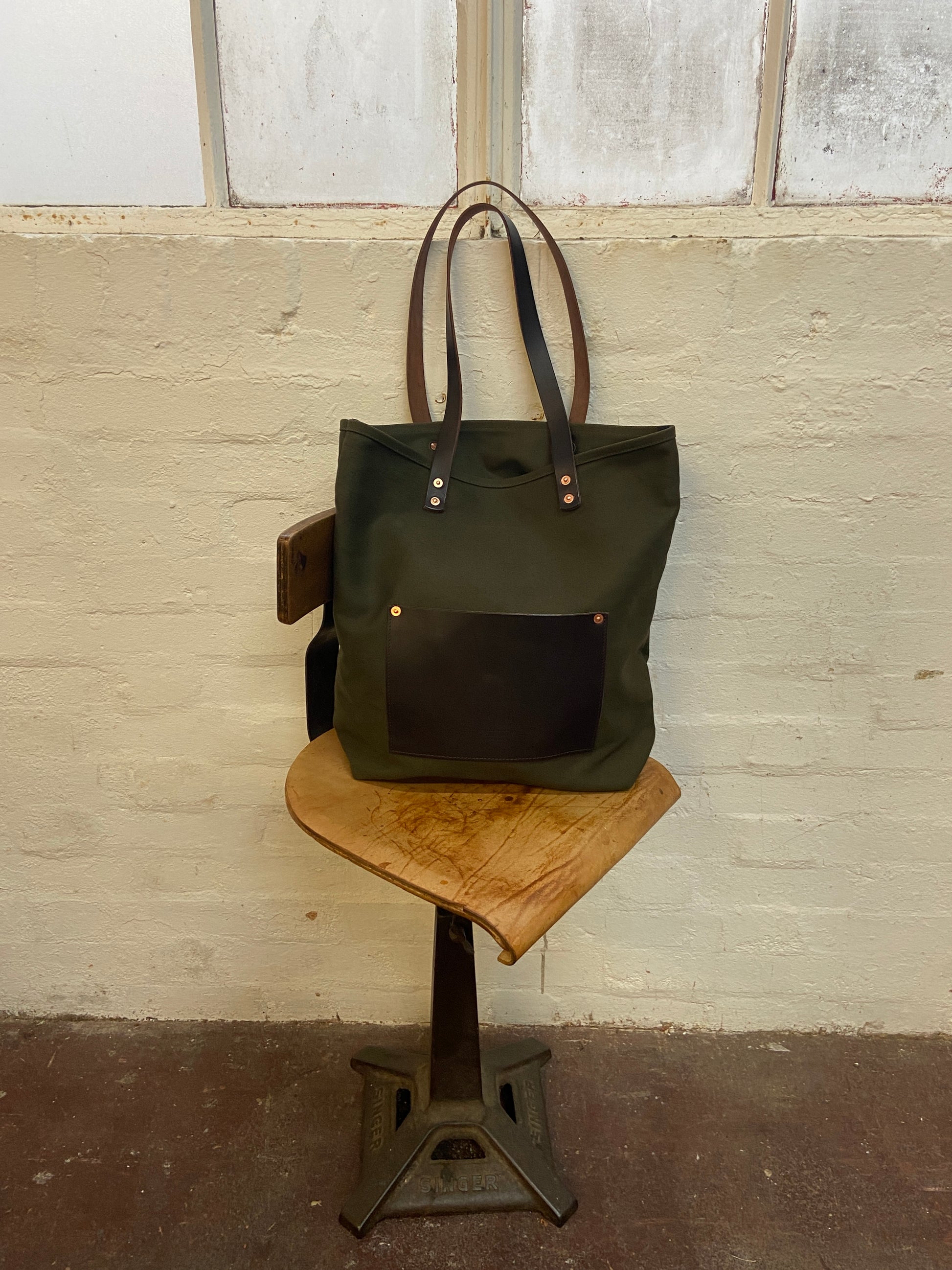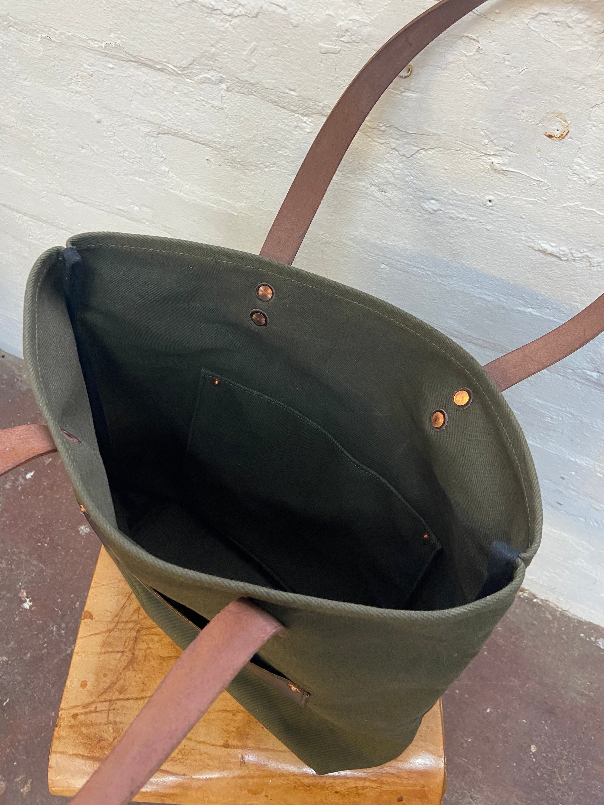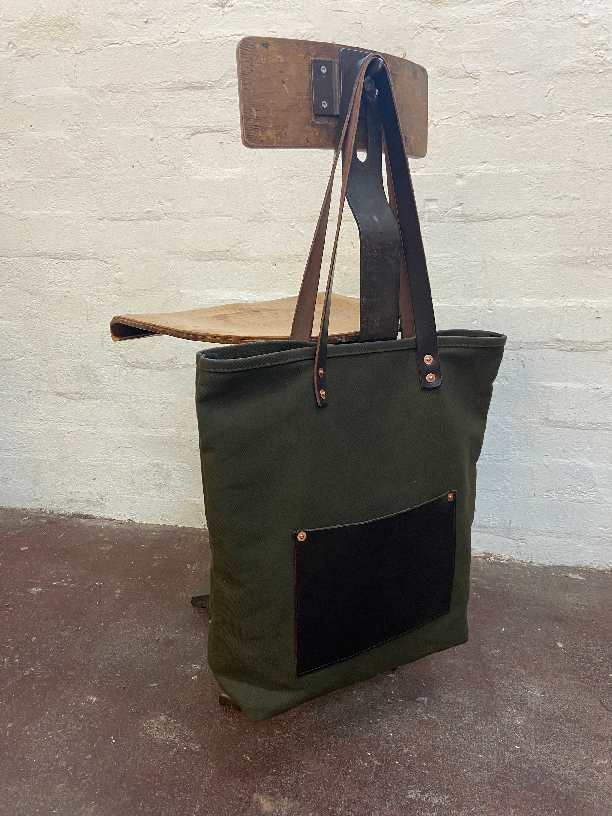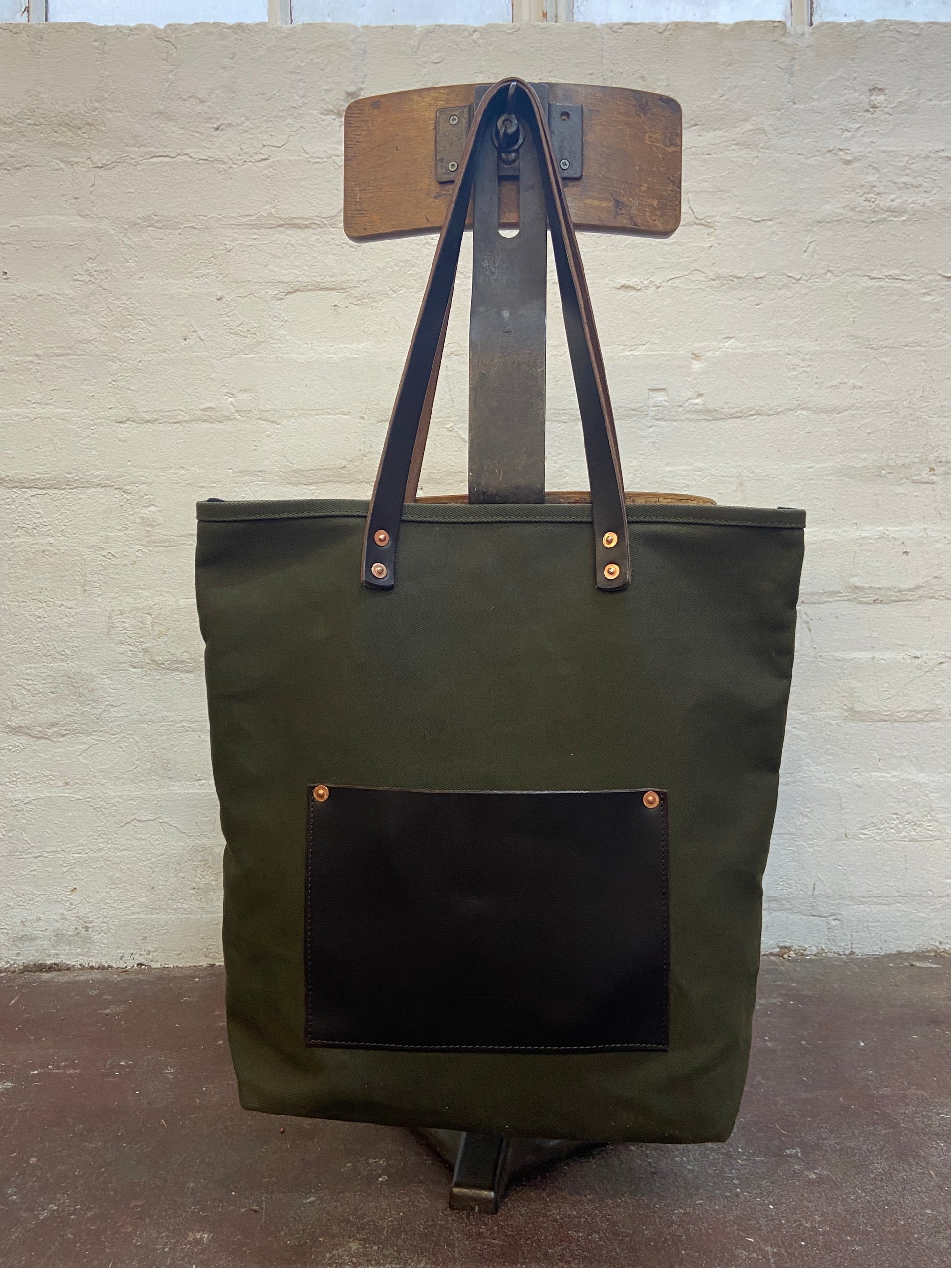 - Brown straps/olive canvas